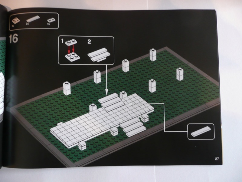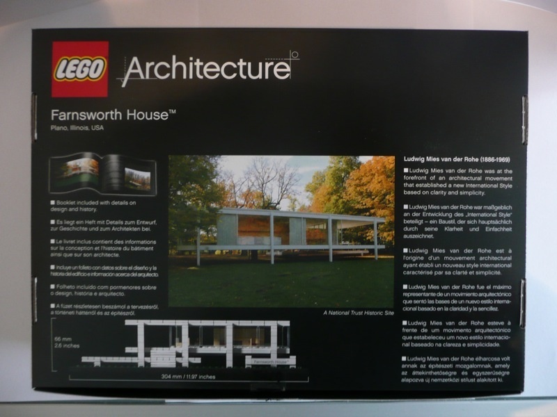 I was really hoping for a spiral bound manual like Fallingwater got, but instead we’re working with a standard glued back. Not a dealbreaker though. You still get 9 pages packed with information about the house and its architect, Ludwig Mies van der Rohe. The background info really adds to the building experience.